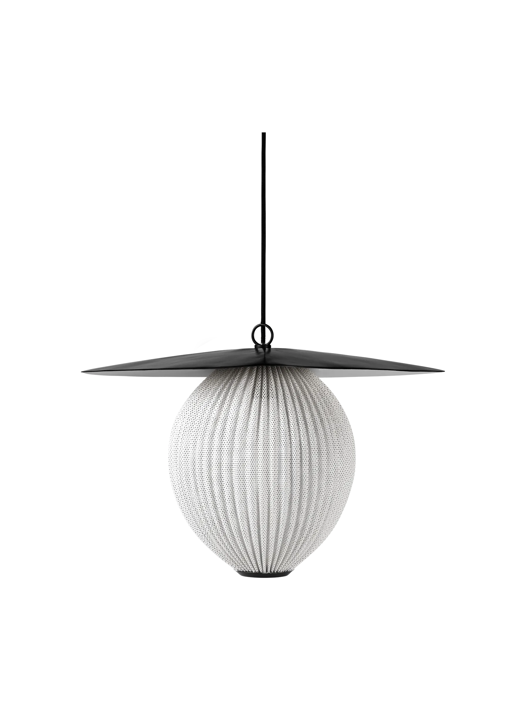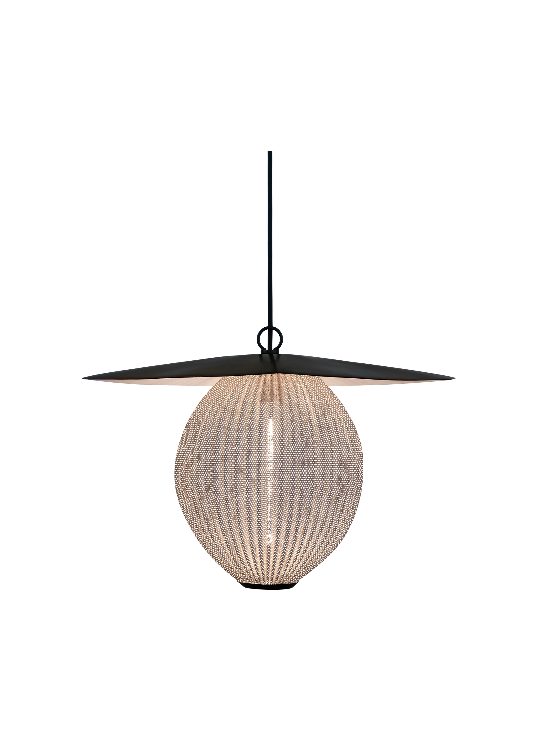 The Satellite Pendant of two sizes is designed by Mathieu Matégot in 1953 with geometrical shapes and an organic shade to create outstanding sculptural aesthetics. The name, Satellite, was given by Matégot as a wink and tribute to the scientific progress in France in the years after the Second World War. The Satellite Pendant holds the distinctive trait of Rigitulle, a technique and material invented by the designer himself that makes it possible to bend and fold the fabric-like metal sheet to an original, oblong-shaped pendant lamp. The lampshade has five colour options; midnight black, white cloud, shy cherry, venetian gold and rainy grey, and is unique with its bulb all covered by perforated metal to exude an atmospheric light - creating a festive appearance. The interplay of light and shadow cast on walls and floors generate a dramatic feature in any dining room, hallway or restaurant. Hang the Satellite Pendant alone as a character piece or in multiples to create a cloud of luminosity.