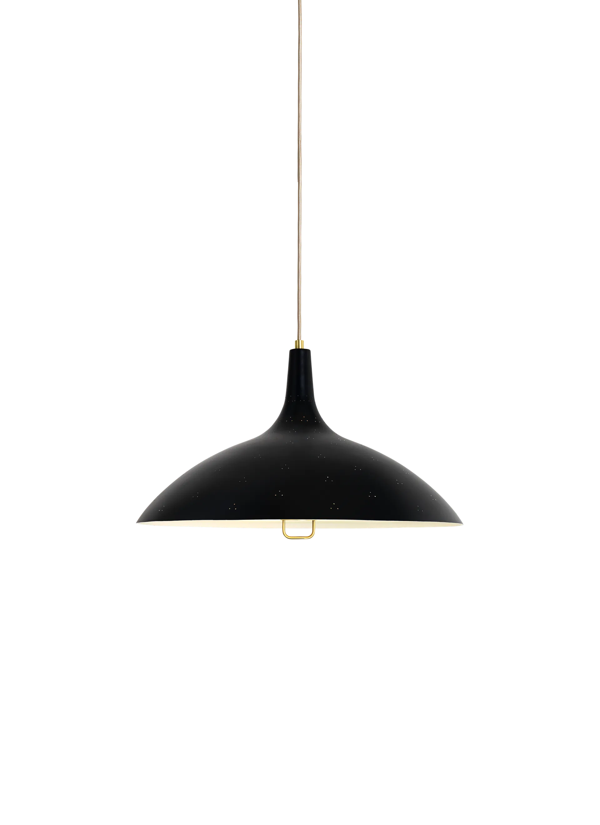 The 1965 Pendant was originally designed by Paavo Tynell in 1948. Like many of his best-known designs, the pendant was designed for the Finland House in New York - one of the most ambitious and successful projects of all time to showcase Finnish design. Perfecting the techniques of metal finishes, Tynell developed the 1965 Pendant with his exceptional ability to capture and translate a grace and exuberant lightness into his brass creations. Characterized by its triangular perforation pattern, an artistic detail utilised by Tynell in several of his lighting objects, the 1965 Pendant reflects the distinguished craftsmanship of the Finnish designer. With a frosted glass diffuser that softens the light, the pendant contributes to a subtle and tranquil environment.