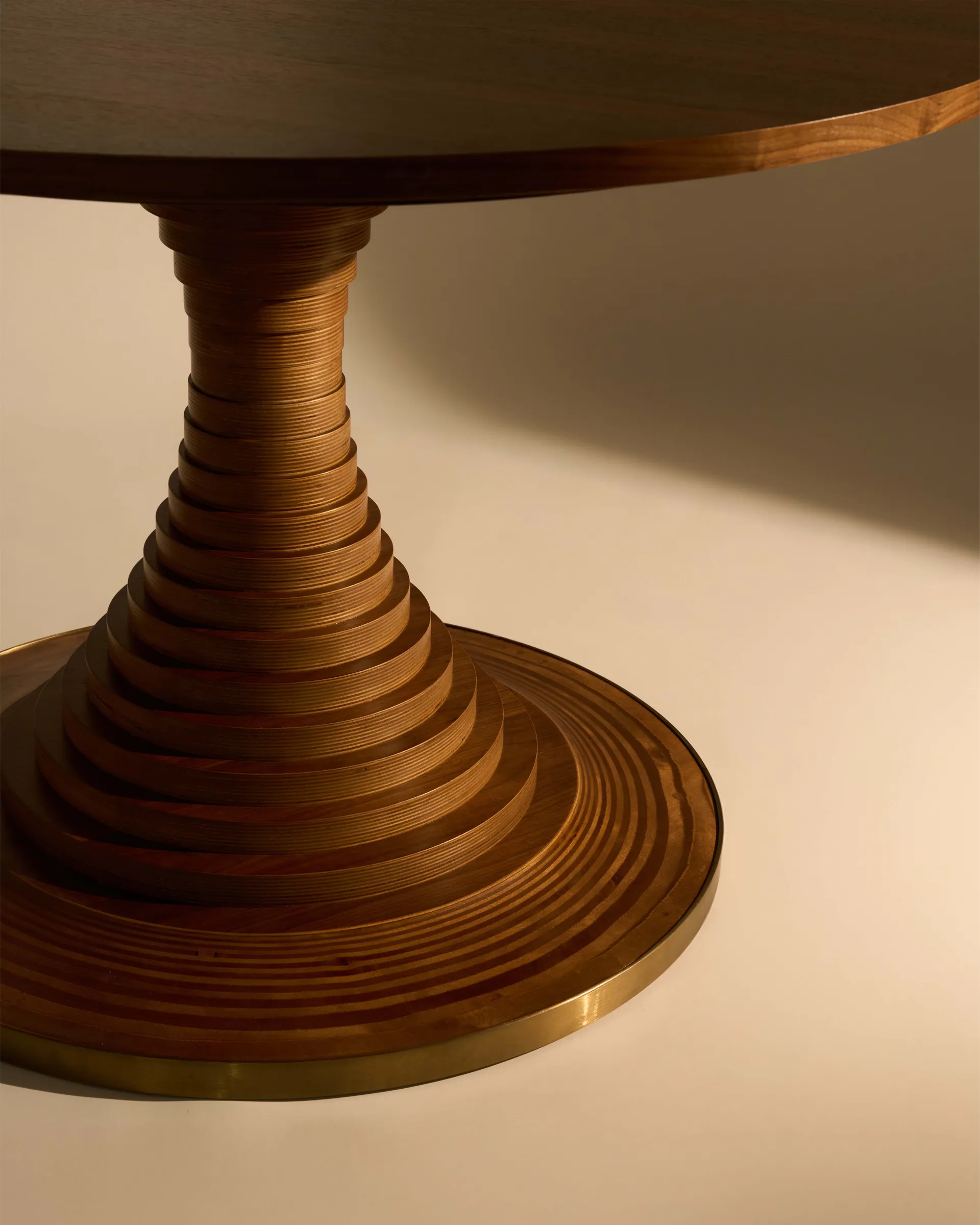 Though simple in its silhouette, the Tavolo a Dischi’s construction is complex in form, structure, and aesthetic detail. Stacked 3 cm-thick discs of FSC® Mix-certified birch plywood (FSC® C176589) conceal a cylindrical metal core, which lends the table stability. The base is accented by a protective band of burnished brass-toned steel, creating an engaging contrast with the wood’s material expression.