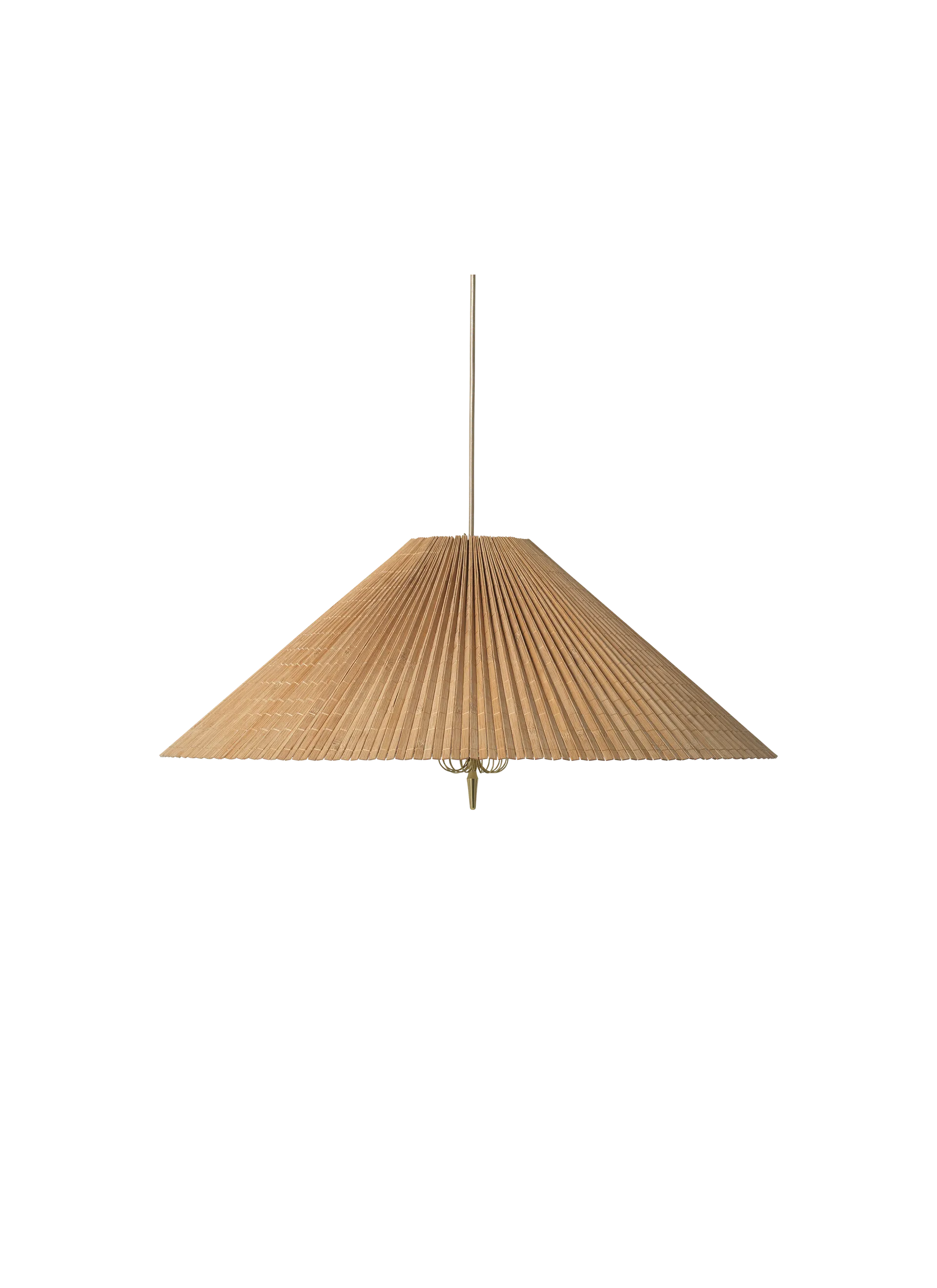 Designed by the legendary Paavo Tynell, the 1972 pendant features a conical shade in bamboo, crafted by master artisans. The bamboo slats are hand sewn into a pleated mat and fastened by hand to the wire frame, with a linen liner in between. This directs light down towards the base and creates a diffuse glow around the shade and upward, as the bamboo slats are penetrated by the light. Tynell's signature brass details are present as well, adding an air of timelessness and perfectly complementing the warm tone of the wood and light. Below the bulb, a fabric diffuser modulates the light and, beneath this, a decorative brass detail gives each lamp a flourish of character, and subtly influences the play of light it generates.