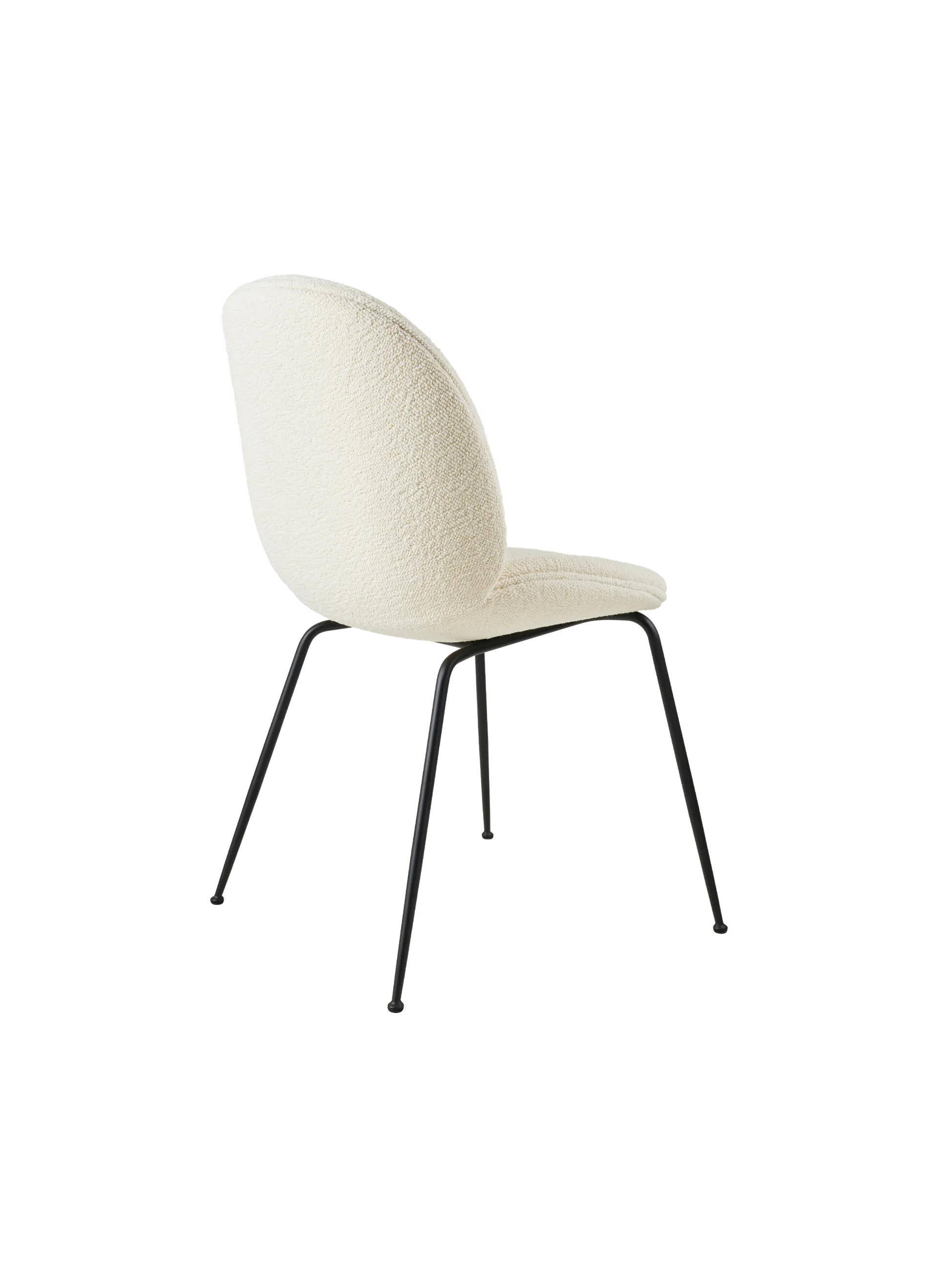 The Beetle Dining Chair can be customized in any one of a vast array of fabrics and materials, further echoing the versatility of its insect namesake. The distinctive silhouette enables the Beetle to carry bold colors with tactile expressions, or upholsteries can be color matched to the shell for a more understated finish.