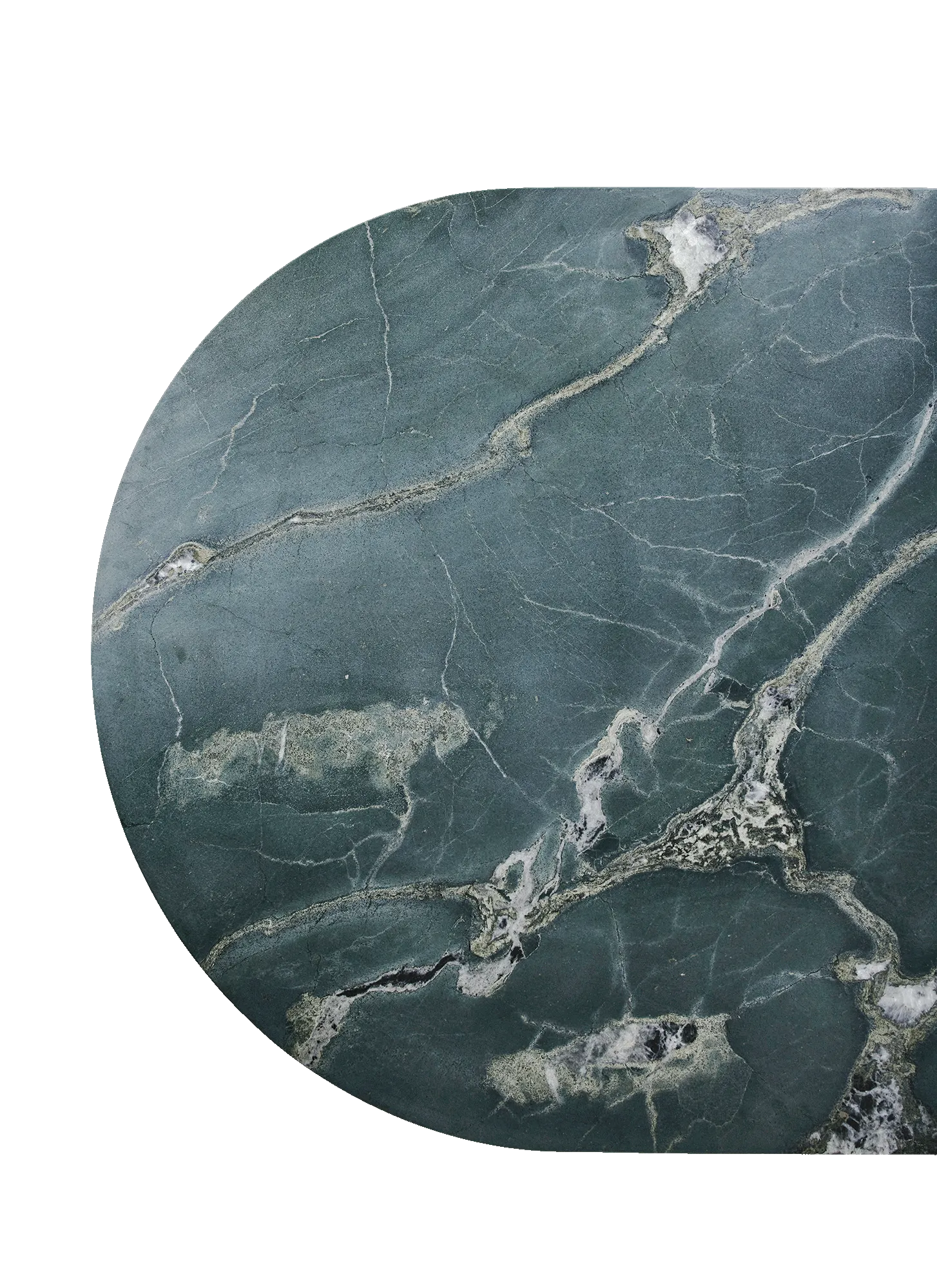 The variety of quartzite used is distinguished by its dark green hue, threaded with black veins, gray swirls, and scattered white crystal clusters. Thanks to the way the stone has been formed over millennia, each Epic Outdoor Table has an individual expression – no two pieces are alike. Every shift in tone or veining pattern tells its own story about the actions of the Earth and the formation of the stone.