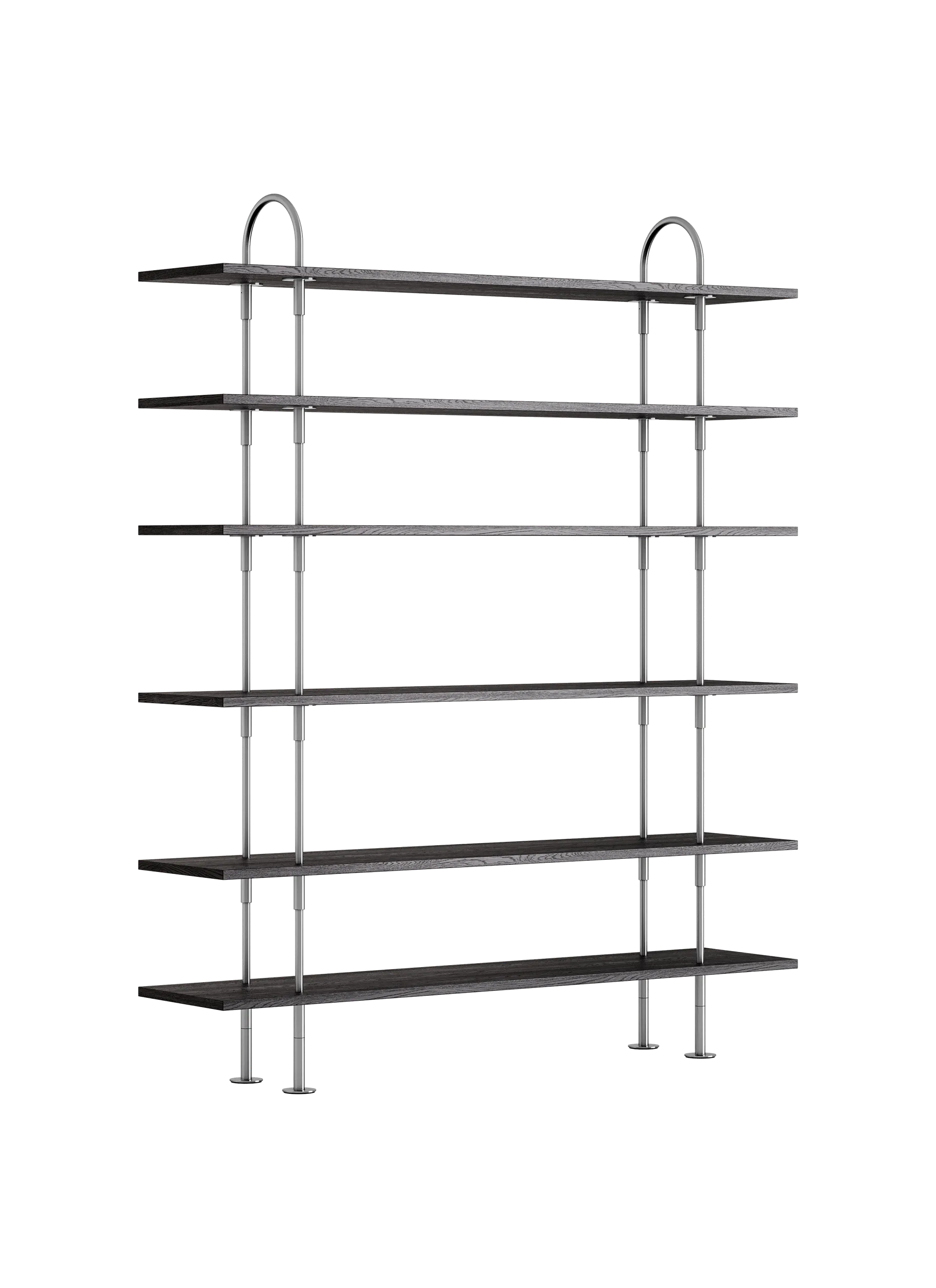 The core components of the system are vertical metal rods, three lengths of open shelf, an enclosed box shelf, feet for the bottom, and soft arches at the top. The connectors enable the unit to be extended vertically by adding more rods and shelves, with each rod piercing the shelf above through a specially engineered connector bracket.