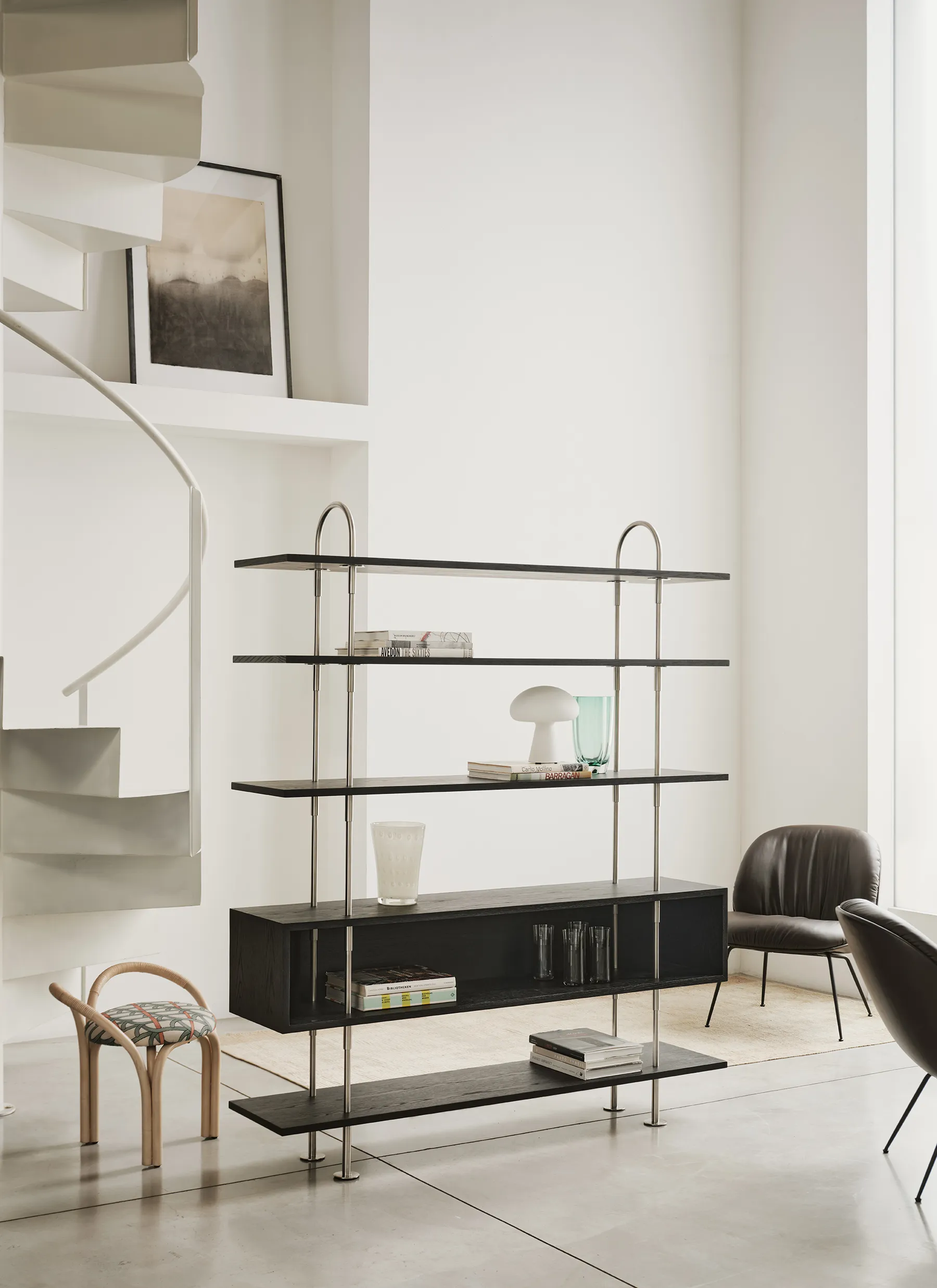 Keen’s character emerges from the bottom up. Its oversized feet ensure the shelves’ stability while lifting the frame visually from the floor, bringing a sense of animation and architectural lightness to the overall composition