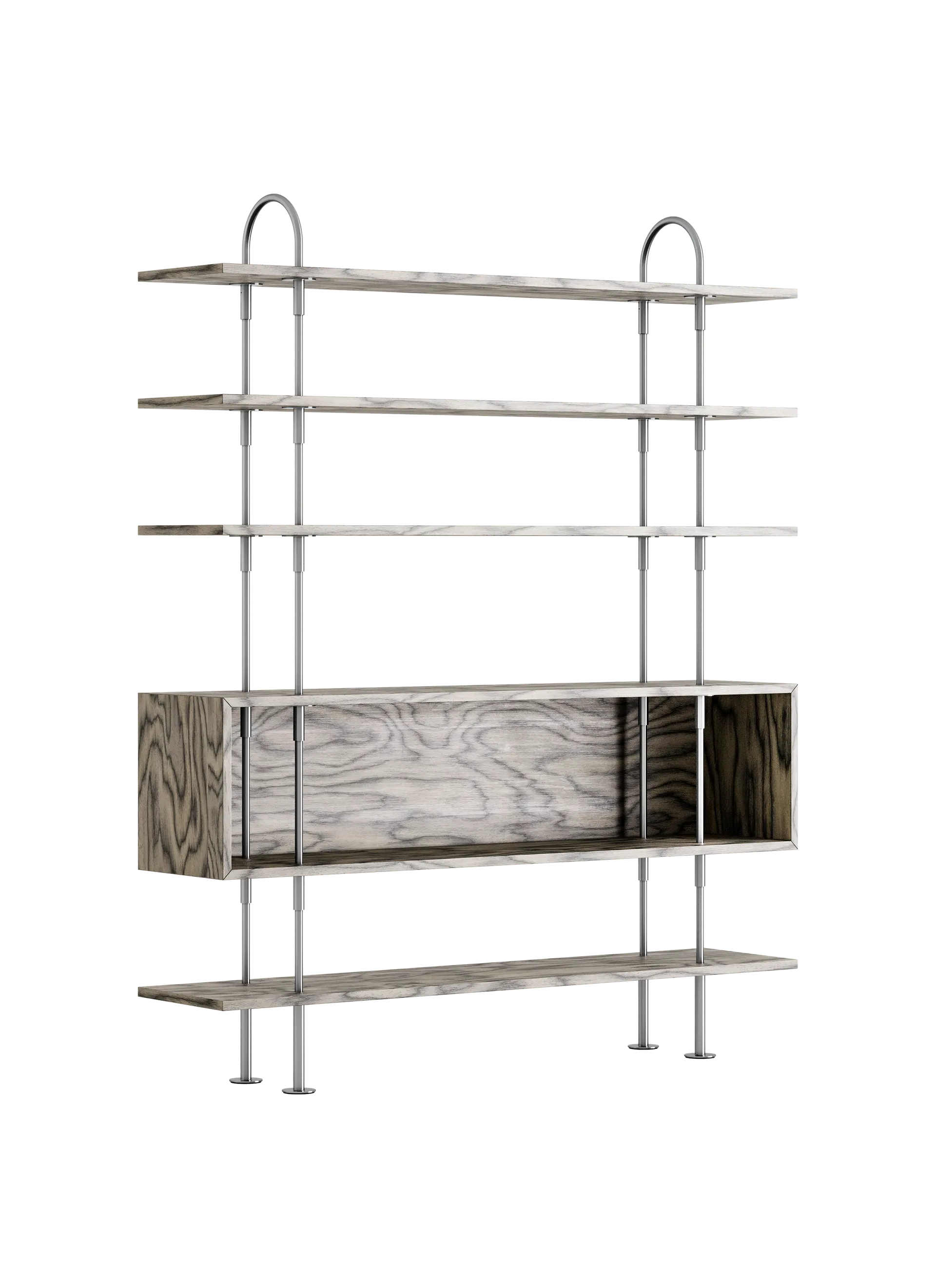 The FSC®-certified black-brown stained ash is the darkest shelf option, offering a quietly confident foundation that supports both utility and visual calm, while the ALPI Sottsass Gray veneer (FSC® C176589) introduces an unexpected softness and tactile depth, with its swirling, almost fabric like patterned gray surface. For a more sculptural and modern aesthetic, cool-gray tinted-glass shelves add semi transparent layers that emphasize Keen’s structural rhythm and playful expressiveness.