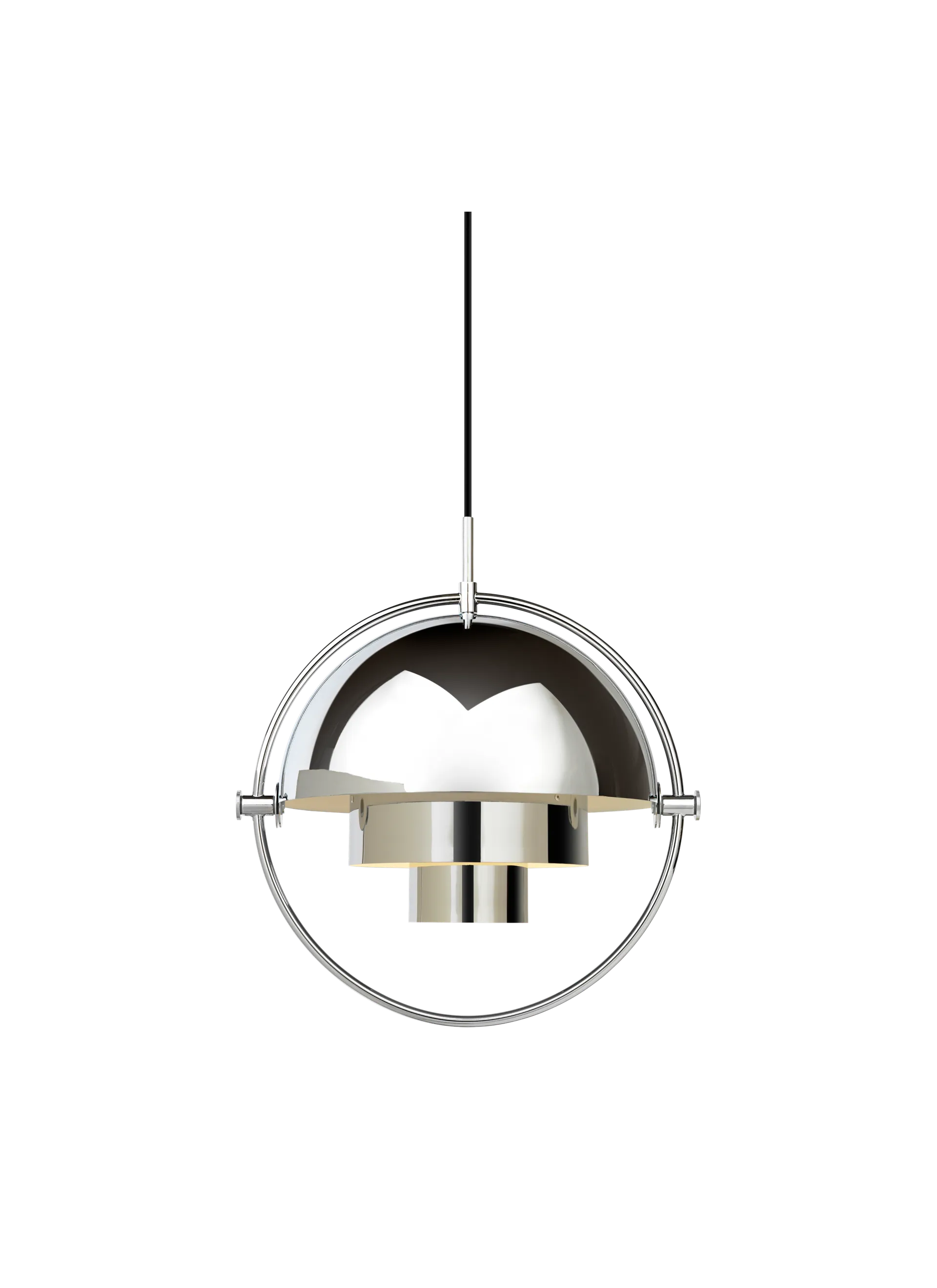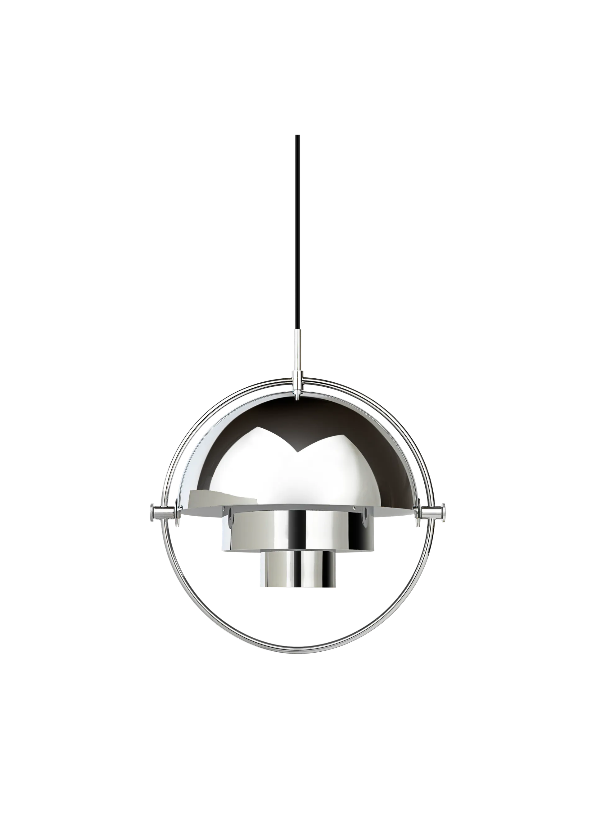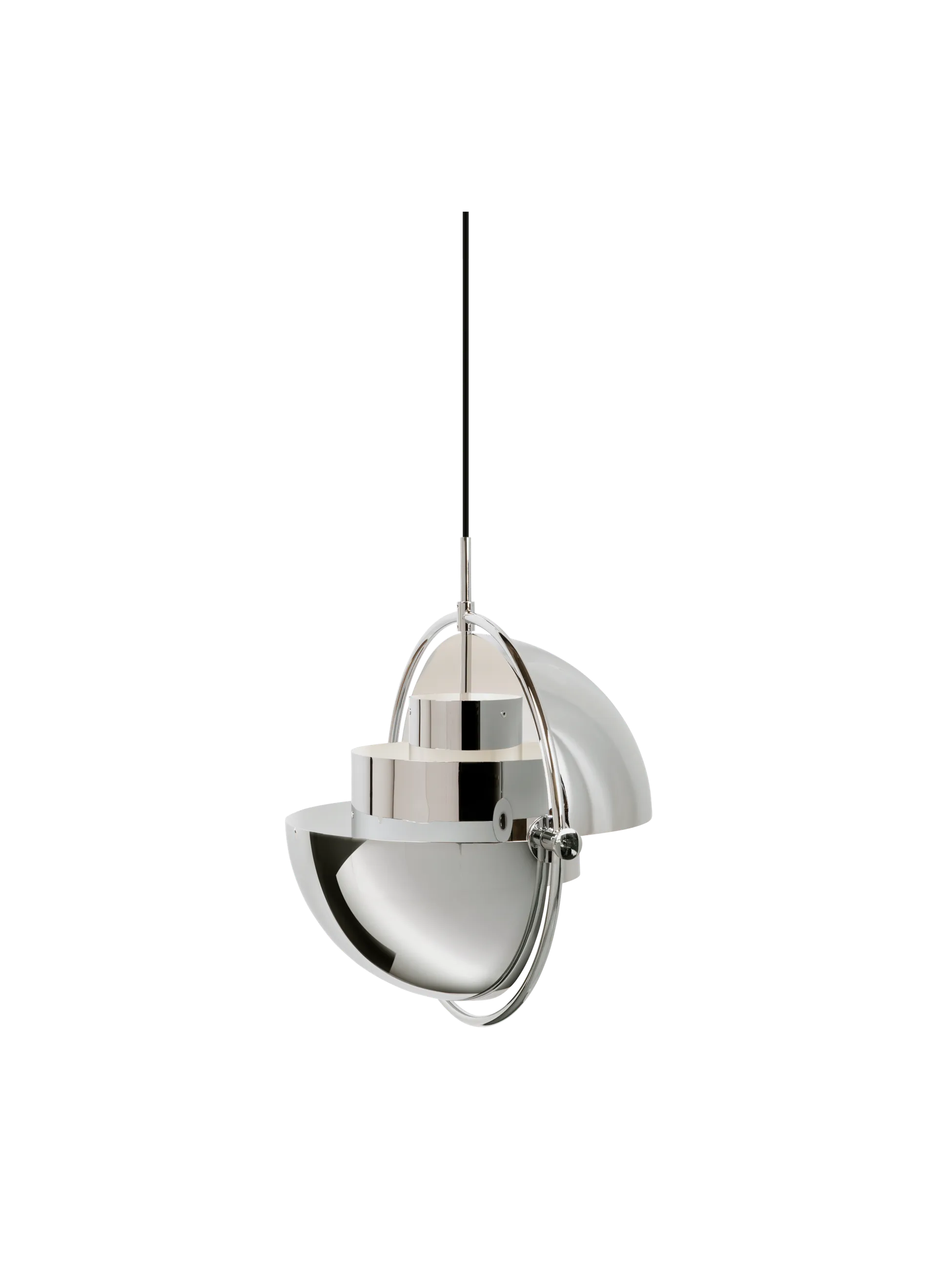 The Multi-Lite Pendant embraces the golden era of Danish design with its characteristic shape of two opposing outside, mobile shades that enable creating a personal installation and a wide range of lighting values in a room. By individually rotating the shades, the Multi-Lite Pendant can be transformed into multiple combinations where the light can be directed upwards, downwards or exude an asymmetrical art light. The Multi-Lite was first drawn in 1972 when Louis Weisdorf did an exception to his own design custom of using multiple repeating elements. Instead, it reflects his passion for diversity. Two cylindrical shapes lay the foundation of the lamp and a metal ring encompasses it and anchors the two quarter-spherical shades, which ultimately completes a picture of an iconic design with multiple purposes. The Multi-Lite Pendant has a timeless expression that fits into any domestic setting.