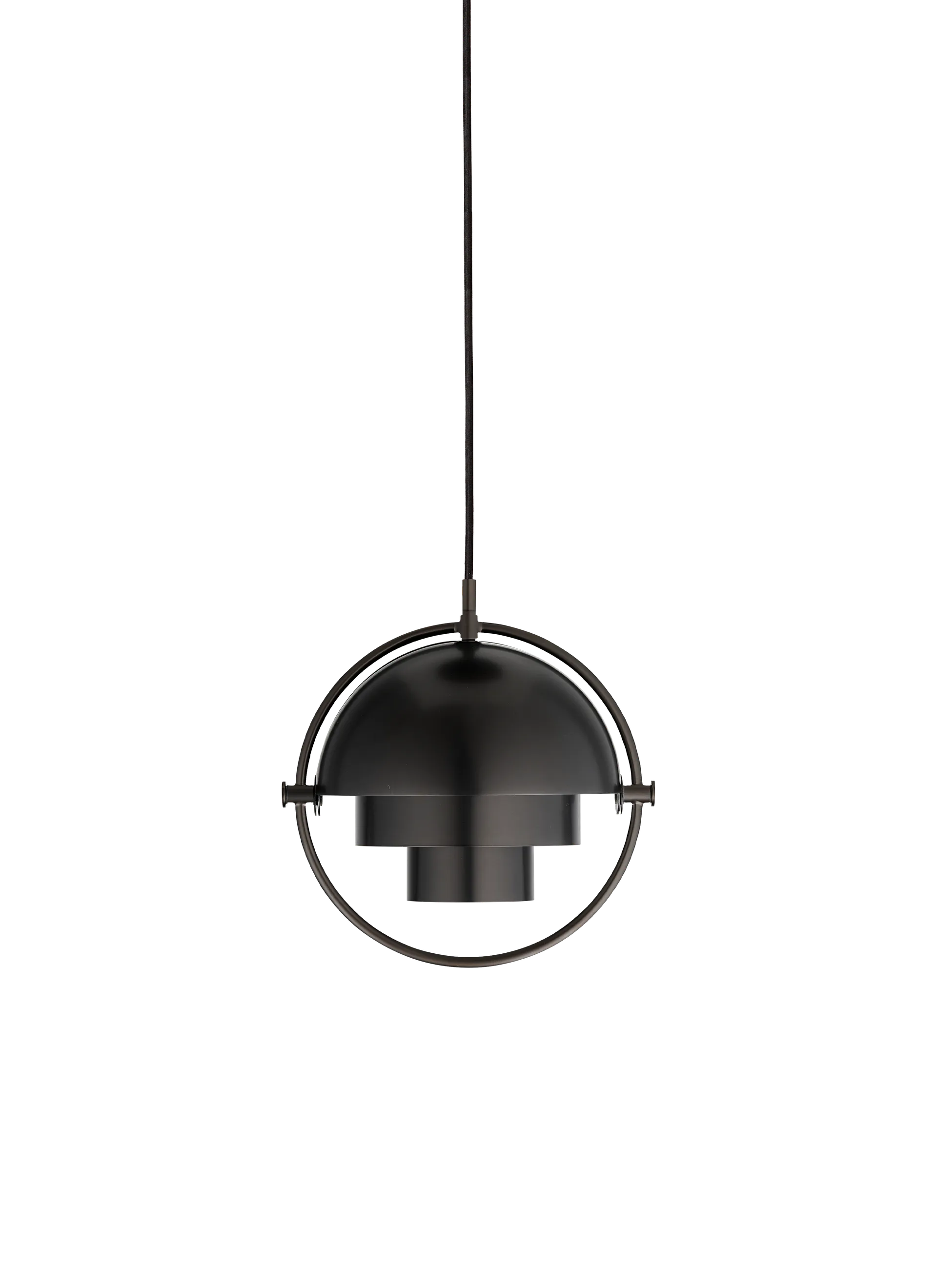 The Multi-Lite Pendant embraces the golden era of Danish design with its characteristic shape of two opposing outside, mobile shades that enable creating a personal installation and a wide range of lighting values in a room. By individually rotating the shades, the Multi-Lite Pendant can be transformed into multiple combinations where the light can be directed upwards, downwards or exude an asymmetrical art light. The Multi-Lite was first drawn in 1972 when Louis Weisdorf did an exception to his own design custom of using multiple repeating elements. Instead, it reflects his passion for diversity. Two cylindrical shapes lay the foundation of the lamp and a metal ring encompasses it and anchors the two quarter-spherical shades, which ultimately completes a picture of an iconic design with multiple purposes. The Multi-Lite Pendant has a timeless expression that fits into any domestic setting.