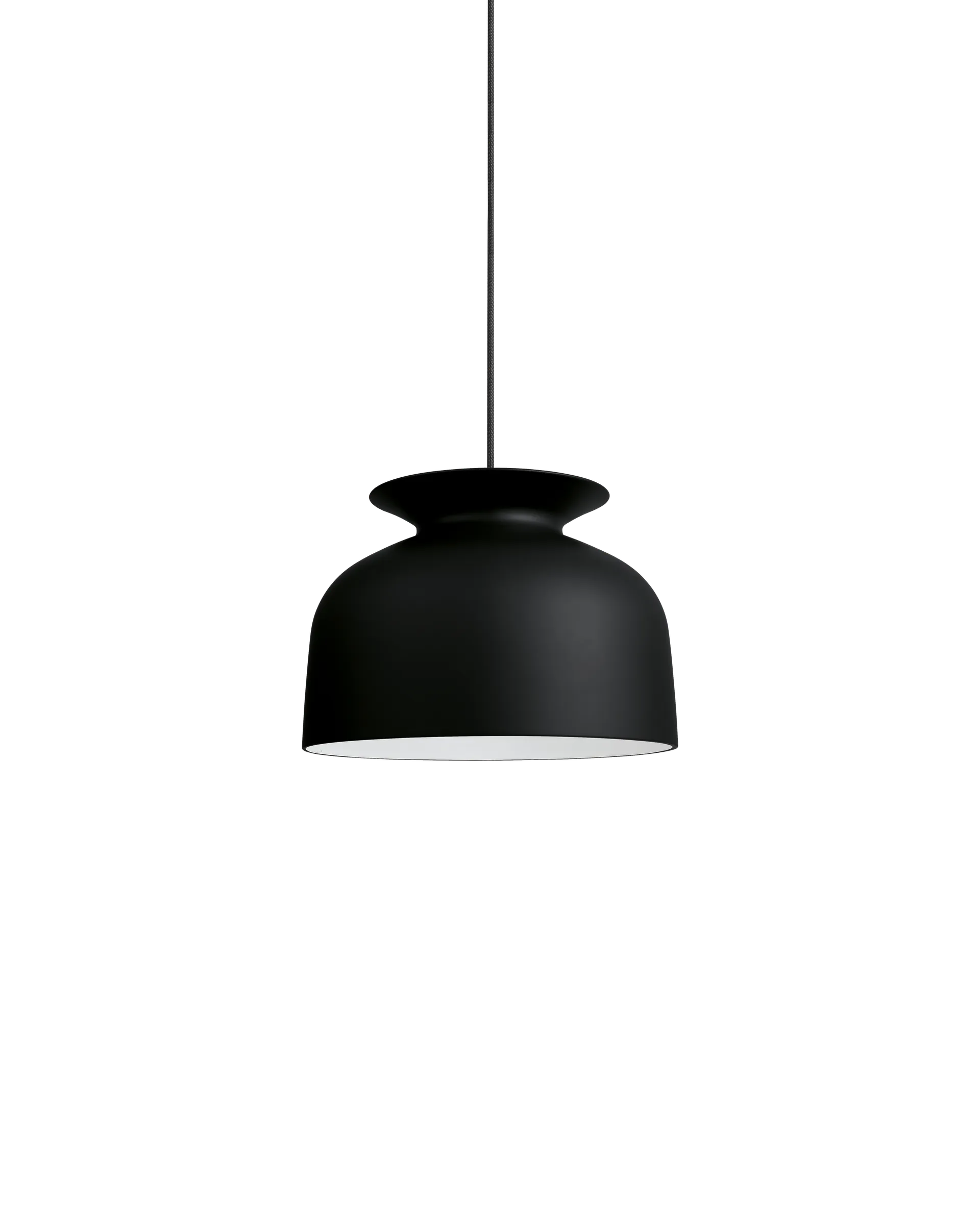 With it's industrial, yet friendly look Ronde Pendant is well-suited for both home decor and professional environments. Hang a few Ronde Pendants in the kitchen, place the smallest Ronde on each side of the bed or use one of the larger Ronde Pendants above the dining table to set just the right lighting atmosphere. The bell-shaped Ronde Pendant in two sizes has reference to the traditional pendant lamp and the heyday of 1970's lightning design; however, in a modern interpretation. A unique detail of the Ronde Pendant is the opening on the top with an overhanging collar that reminds of a jar such as a vase or an amphora. The mainly downwards directed light from conventional pendants does in this design also spread out of the spout-like opening and casts a smooth light gradient at the wire and ceiling. The hand-turned aluminium lamp shade with an ultra-matt lacquer almost makes it look as if it was made of ceramics. Ronde is in several languages the word for round, circular or rotating but it is also the flat blank used for metal spinning technique, which is rotating around a mould core and shaped to a 3-dimensional body.