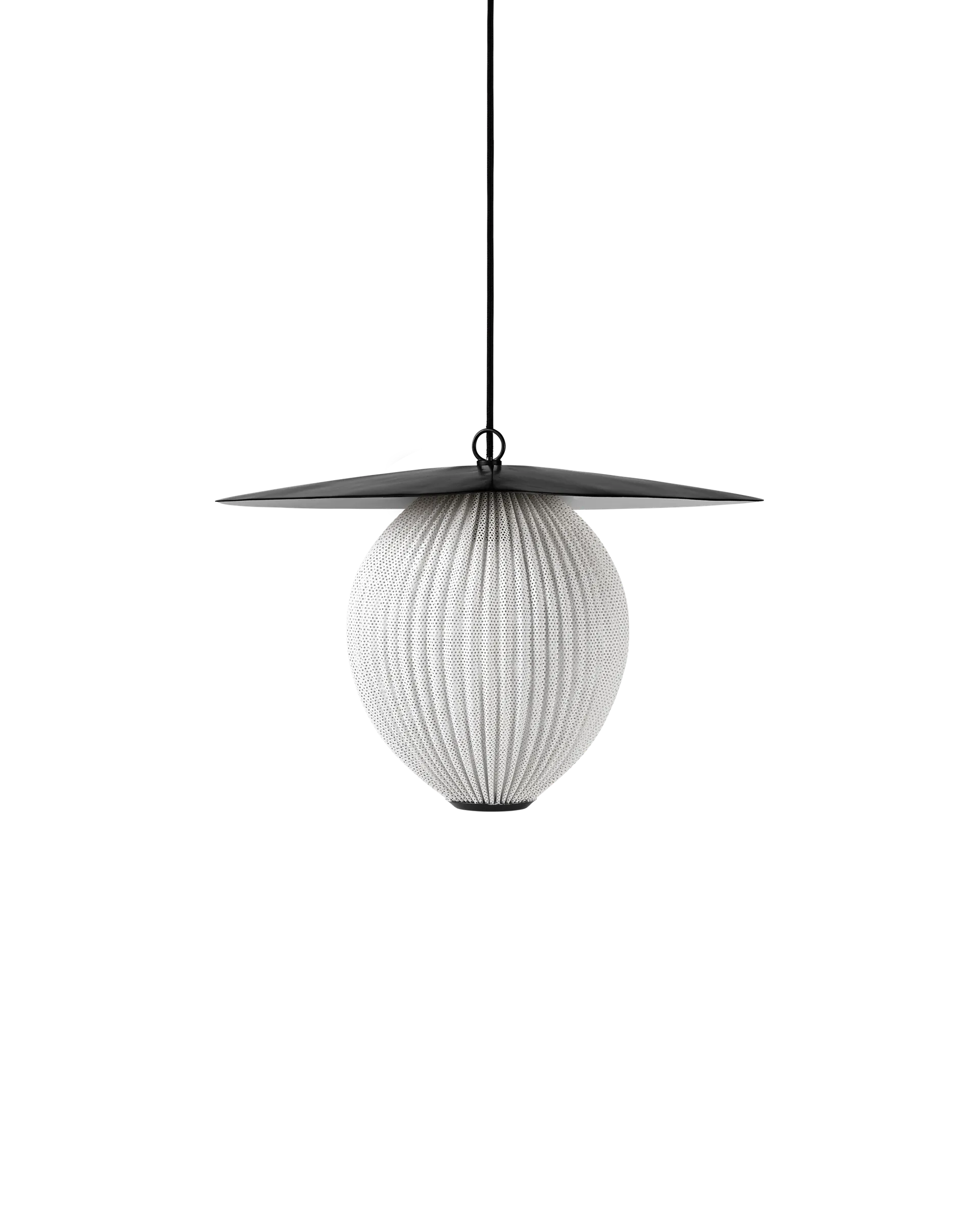 The Satellite Pendant of two sizes is designed by Mathieu Matégot in 1953 with geometrical shapes and an organic shade to create outstanding sculptural aesthetics. The name, Satellite, was given by Matégot as a wink and tribute to the scientific progress in France in the years after the Second World War. The Satellite Pendant holds the distinctive trait of Rigitulle, a technique and material invented by the designer himself that makes it possible to bend and fold the fabric-like metal sheet to an original, oblong-shaped pendant lamp. The lampshade has five colour options; midnight black, white cloud, shy cherry, venetian gold and rainy grey, and is unique with its bulb all covered by perforated metal to exude an atmospheric light - creating a festive appearance. The interplay of light and shadow cast on walls and floors generate a dramatic feature in any dining room, hallway or restaurant. Hang the Satellite Pendant alone as a character piece or in multiples to create a cloud of luminosity.